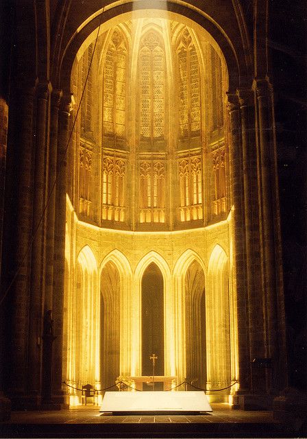 在阿弗朗什的圣维杰珍宝室,今人还可见到据称是留有天使指孔的奥贝尔主教的头盖骨。此后,无数的教士和工匠将一块块花岗岩运过流沙,一步步拉上山顶。众多建筑师和艺术家在这些坚硬的岩石上修整和雕琢。